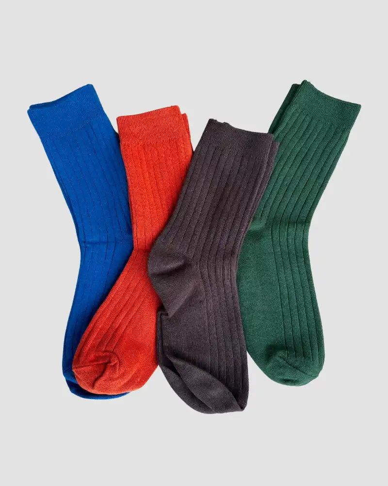 The colorchrome socks collection is made of 4 plain solid colors for calm and reserved. Made of Blue, Orange, Chocolate, Green, and Orange..