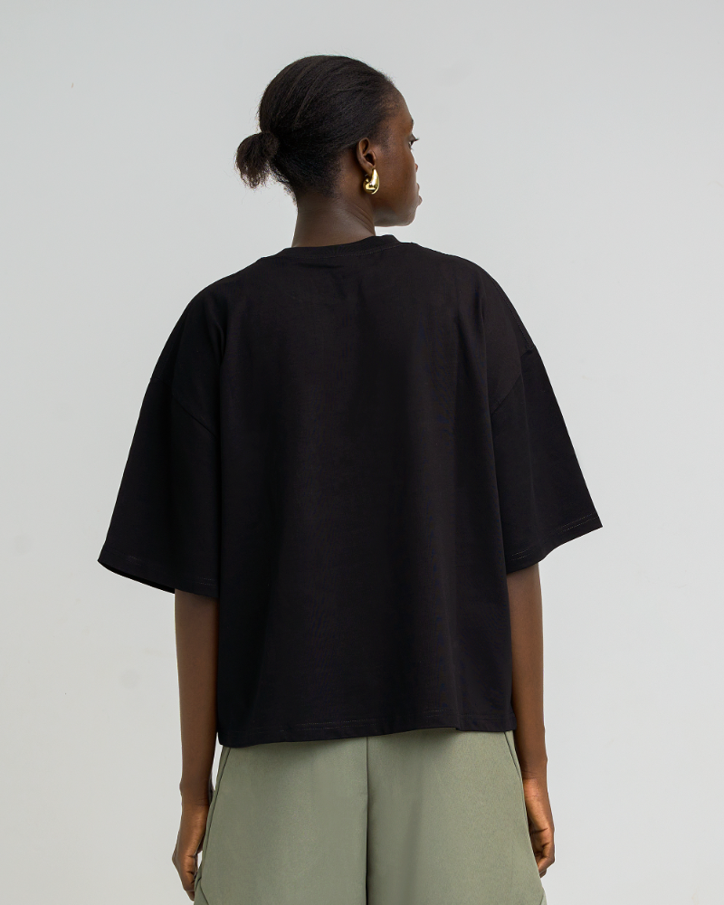Crafted from soft, heavyweight cotton, it’s designed for comfort without compromising on style. Whether you’re dressing it up with trousers or going relaxed with joggers, this black oversized minimal t-shirt is a wardrobe essential for lovers of clean aesthetics.