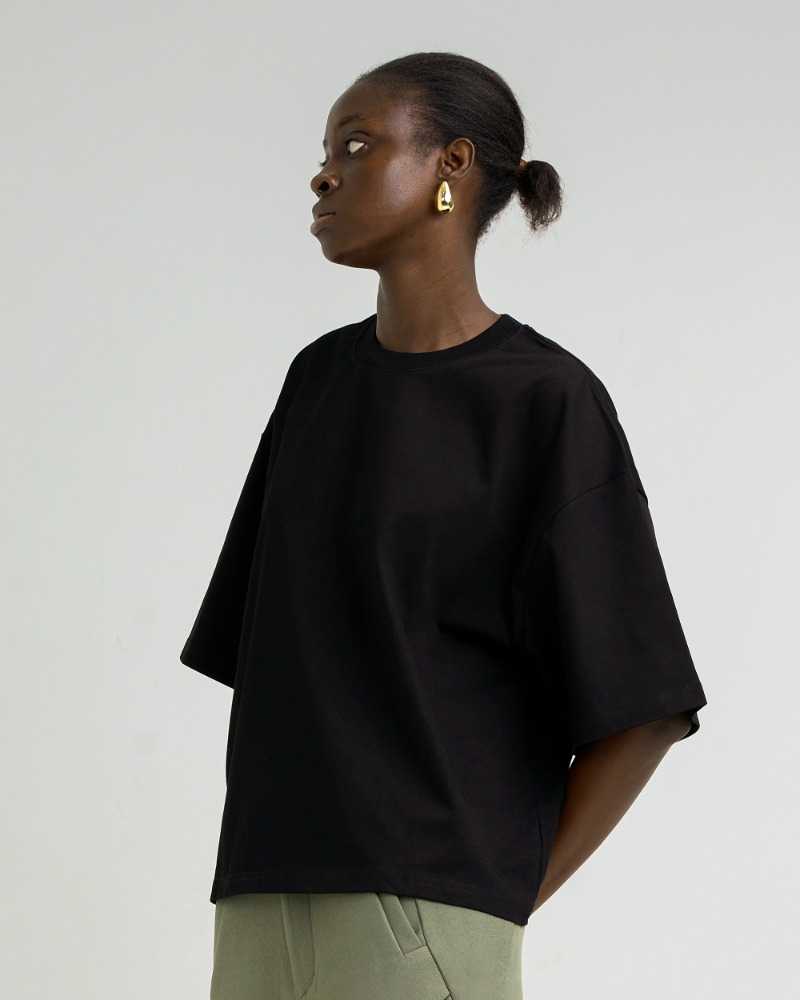 Crafted from soft, heavyweight cotton, it’s designed for comfort without compromising on style. Whether you’re dressing it up with trousers or going relaxed with joggers, this black oversized minimal t-shirt is a wardrobe essential for lovers of clean aesthetics.