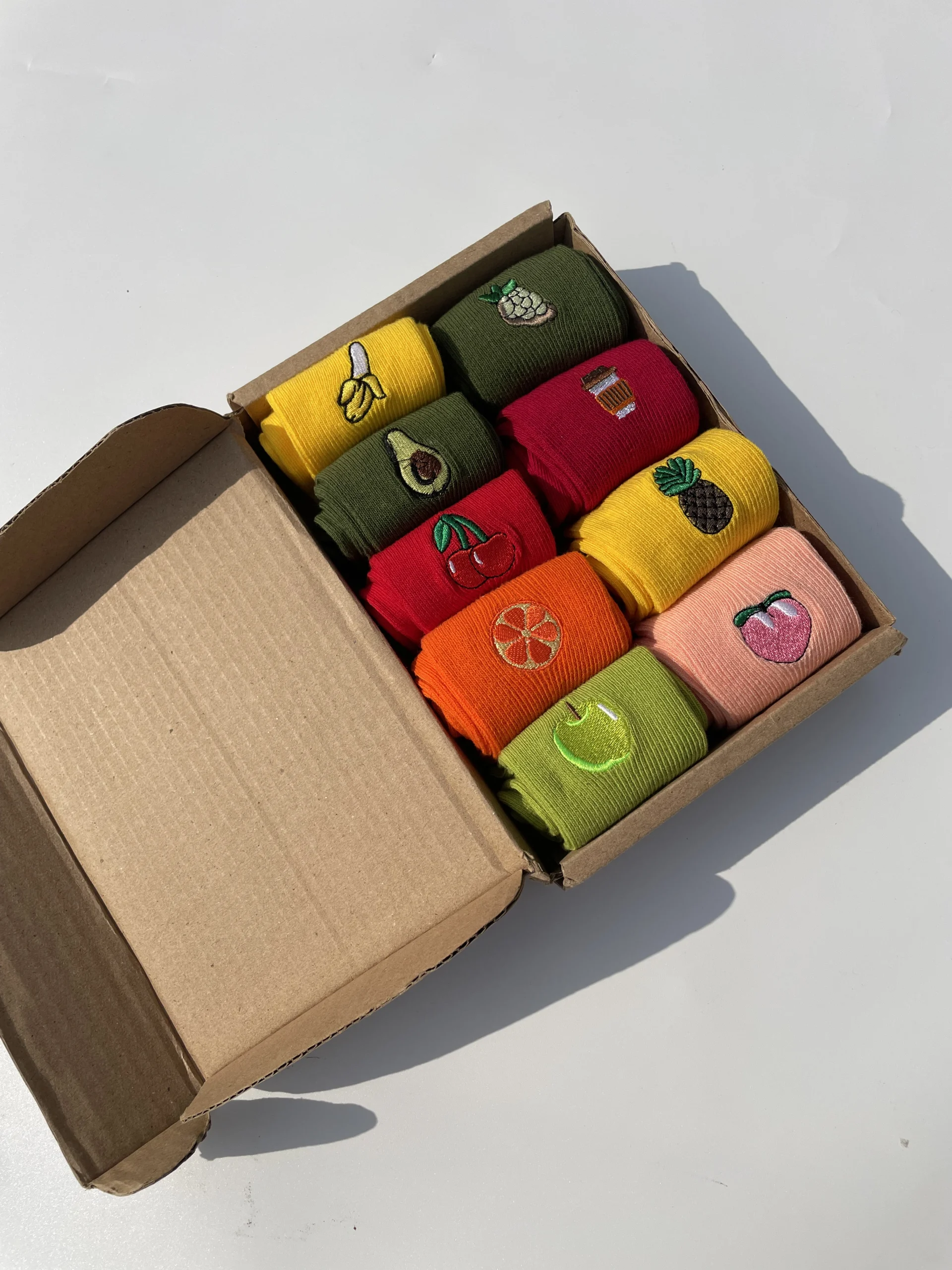 Feel funky with this bundle of 10 fruit socks: Avocado, cherry, and banana. They look absolutely delicious. They are in cool green, red, and yellow colors with super cute embroidery.