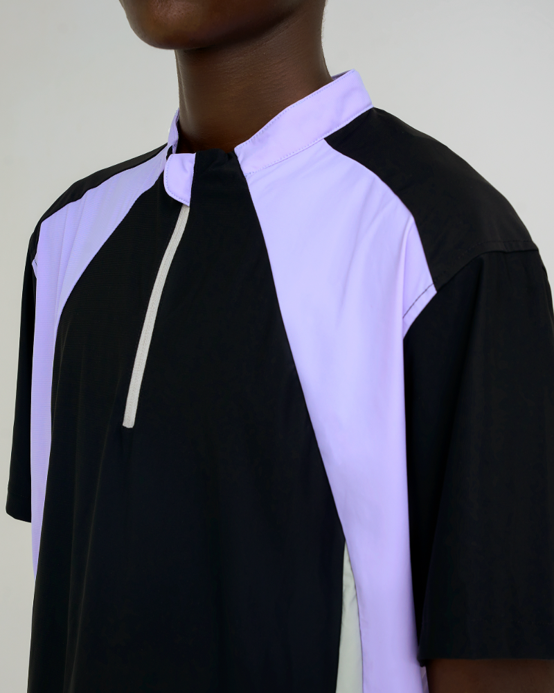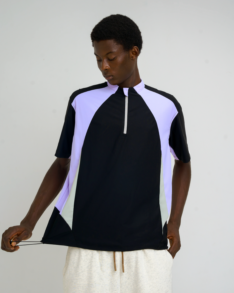 Unleash peak style and performance with the Velocity Panel Zip Tee, a dynamic colorblock half-zip sporty tee built for movement and impact. Featuring a bold panel design in black, lilac, and grey tones, this oversized tee brings a futuristic edge to your streetwear rotation.