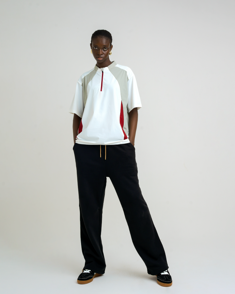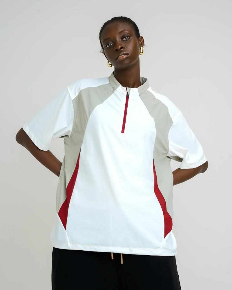 Unleash peak style and performance with the Velocity Panel Zip Tee, a dynamic colorblock half-zip sporty tee built for movement and impact. Featuring a bold panel design in black, lilac, and grey tones, this oversized tee brings a futuristic edge to your streetwear rotation.