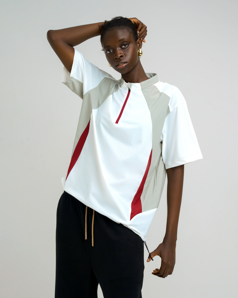 Made from breathable, quick-dry fabric, the half-zip neckline offers customizable comfort, while the adjustable hem with bungee cords gives it that modern techwear twist. Whether you’re heading to the courts or hitting the streets, this colorblock half-zip sporty tee delivers all-day function with undeniable flair.